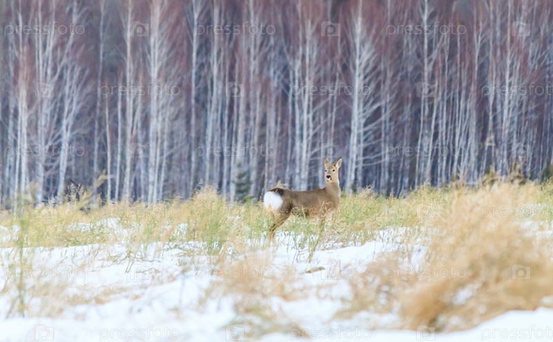 Фотоохота на оленя (Capreolus).Зимний лес