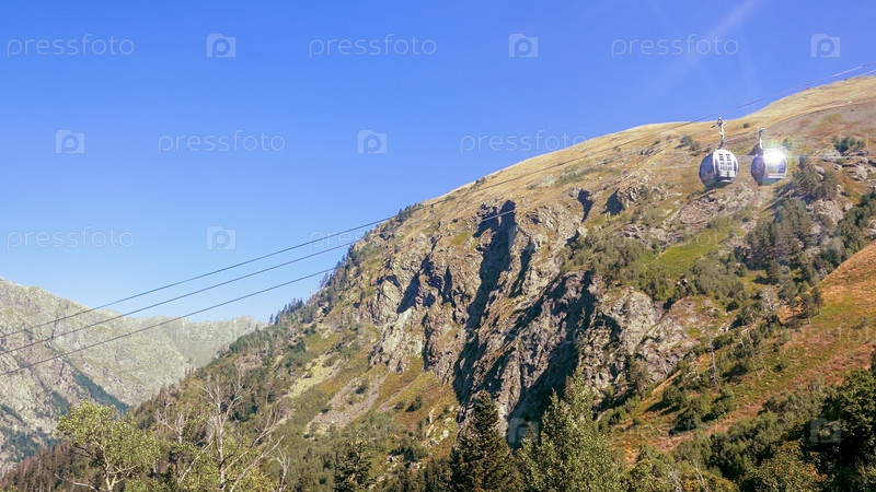 Подвесная канатная дорога летом на горнолыжном курорте. Движение на фоне леса и гор. Россия, Домбай