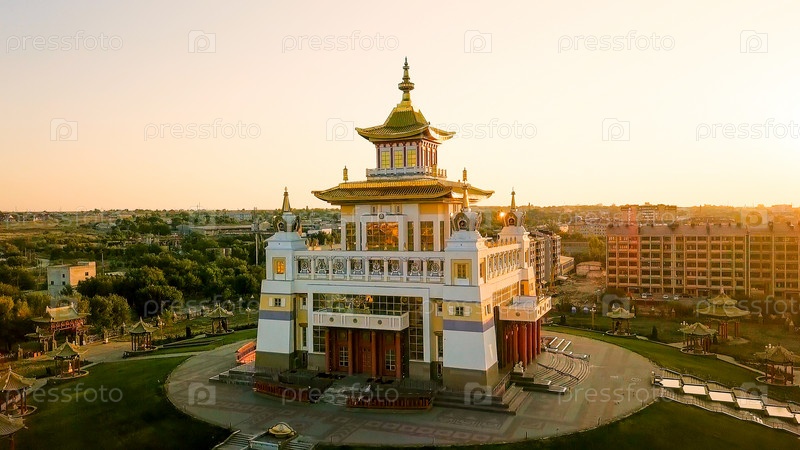 Золотая обитель Будды Шакьямуни на рассвете — крупнейший буддийский храм Республики Калмыкия, один из крупнейших буддийских храмов Европы. Элиста, Россия