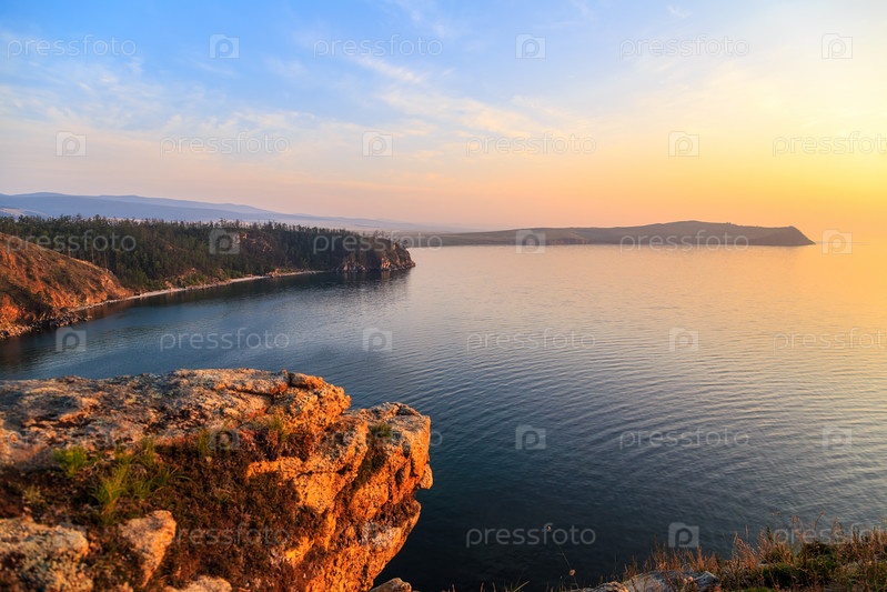 Россия, озеро Байкал, остров Ольхон, залив Малое море. Мыс Улан-Хушун. Вид с мыса Нюрган. Переход от заката к ночи