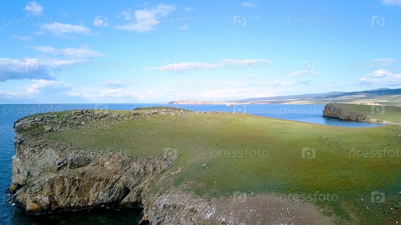 Полет над землей и водой. Россия, Байкал, залив Малое Море. Остров Харанцы. Рядом с островом Ольхон, с дрона