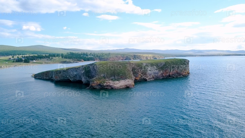 Полет над землей и водой. Россия, Байкал, залив Малое Море. Остров Харанцы. Рядом с островом Ольхон, с дрона