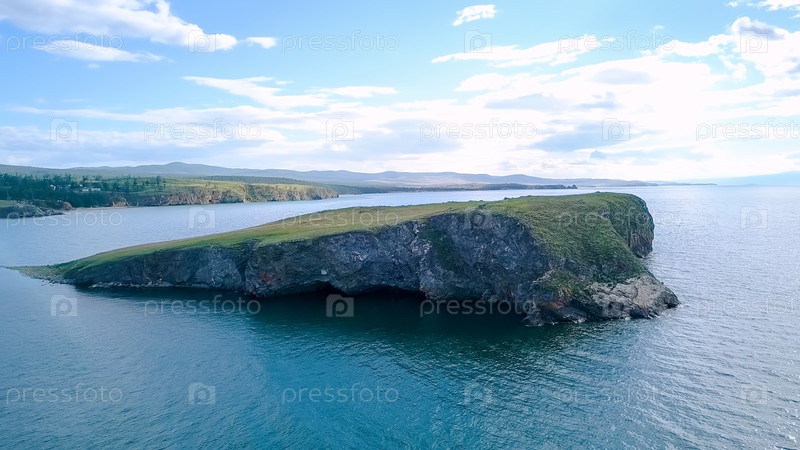 Полет над землей и водой. Россия, Байкал, залив Малое Море. Остров Харанцы. Рядом с островом Ольхон, с дрона