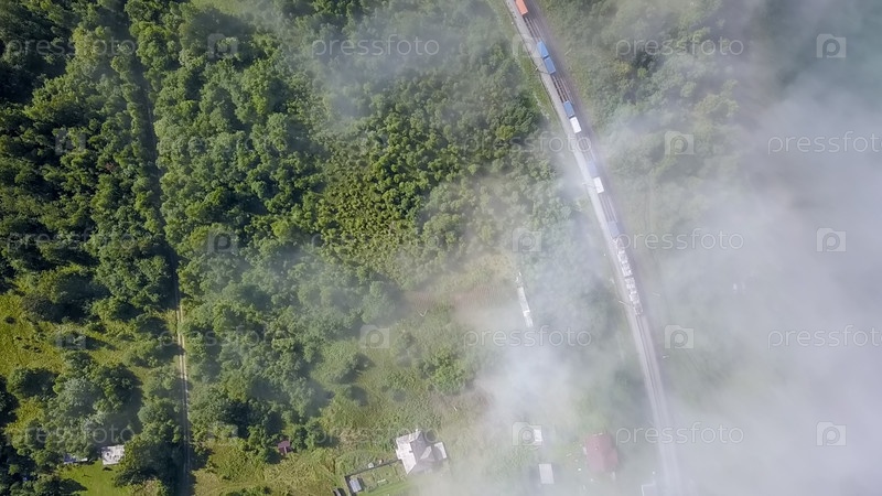 Поезд едет по железной дороге под облаками вдоль побережья. Трансибирская железная дорога. Полет над облаками. Побережье Байкала, с дрона