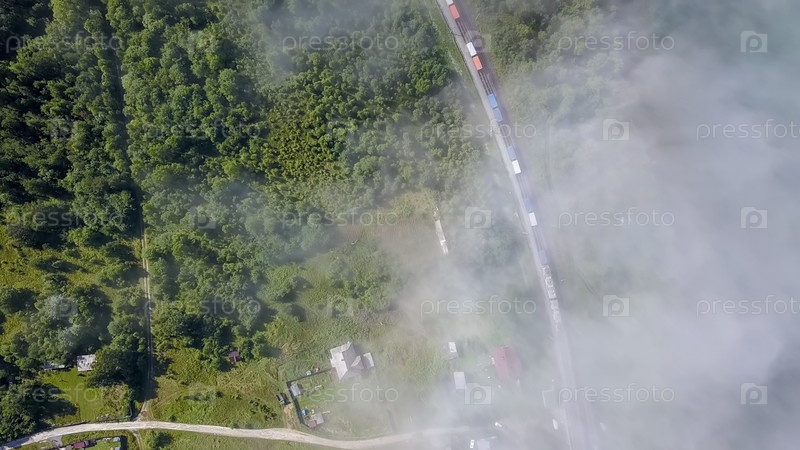 Поезд едет по железной дороге под облаками вдоль побережья. Трансибирская железная дорога. Полет над облаками. Побережье Байкала, с дрона