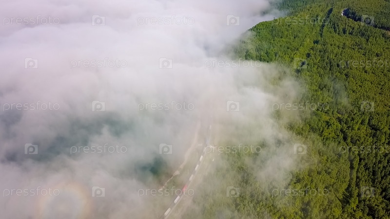 Полет над облаками. Побережье Байкала. Горы, покрытые лесом. Россия, с дрона