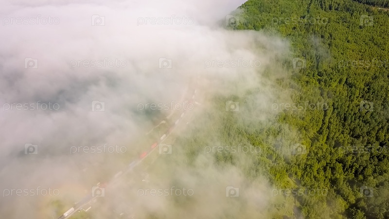 Полет над облаками. Побережье Байкала. Горы, покрытые лесом. Россия, с дрона