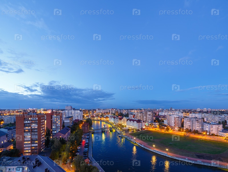 Огни вечернего Калининграда. Река Преголя, набережная Рыбной деревни и Юбилейный мост. Россия, Калининград