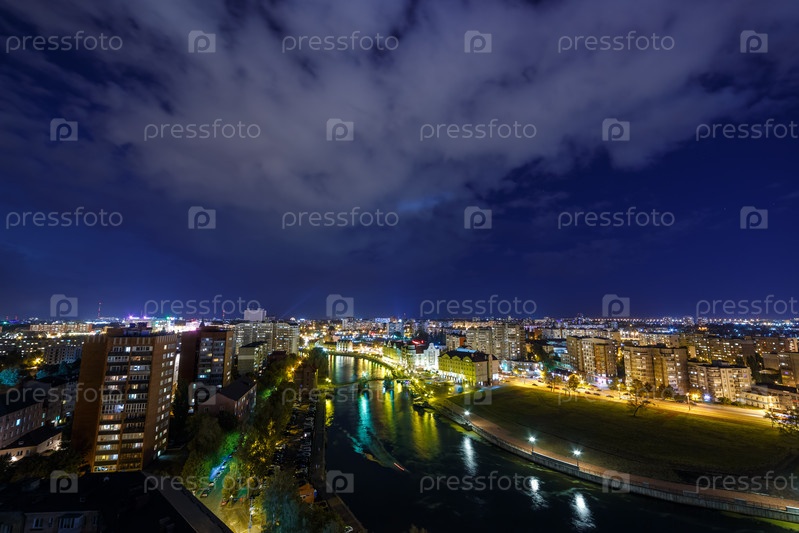 Огни ночного Калининграда. Река Преголя, набережная Рыбной деревни и Юбилейный мост. Россия, Калининград