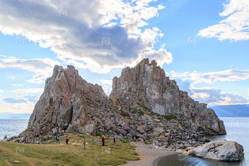 Россия, озеро Байкал. Хужир. Туристы гуляют вокруг Шаман-скала. Остров Ольхон, бухта "Малое Море"