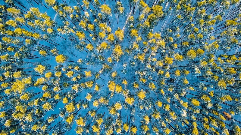 Взлет над сосновым лесом. Вечернее время. Зимняя ясная погода, с дрона, СНИМОК ГОЛОВЫ