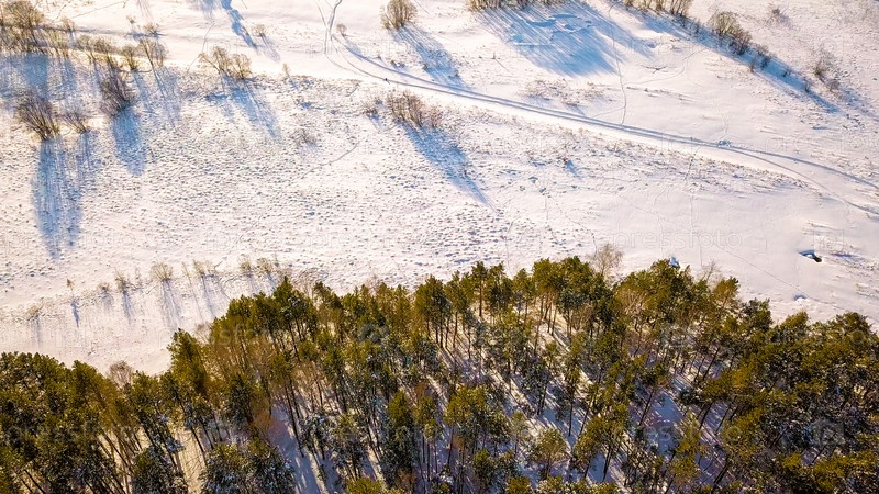 Пролет из соснового леса по заснеженным полям и домам. Вечернее время. Зимняя ясная погода, От дрона