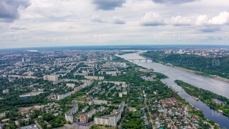 Панорама города Нижнего Новгорода, Россия. С высоты птичьего полета. Река Ока