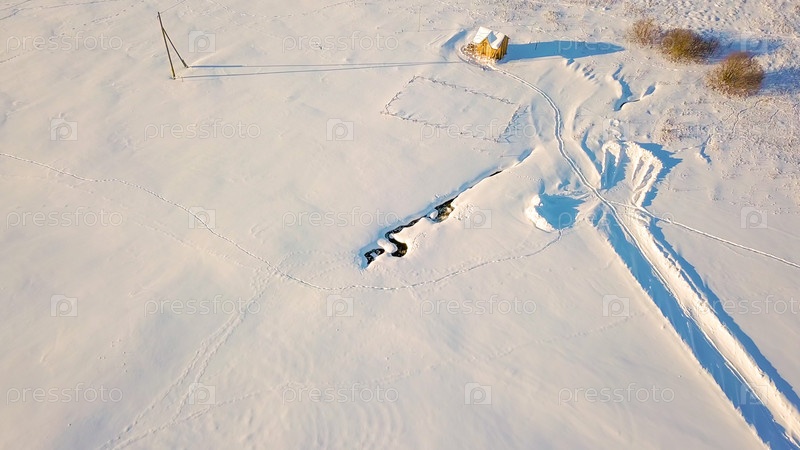 Заснеженное поле с проталиной от ручья. Следы диких животных. Зимняя ясная погода, От дрона