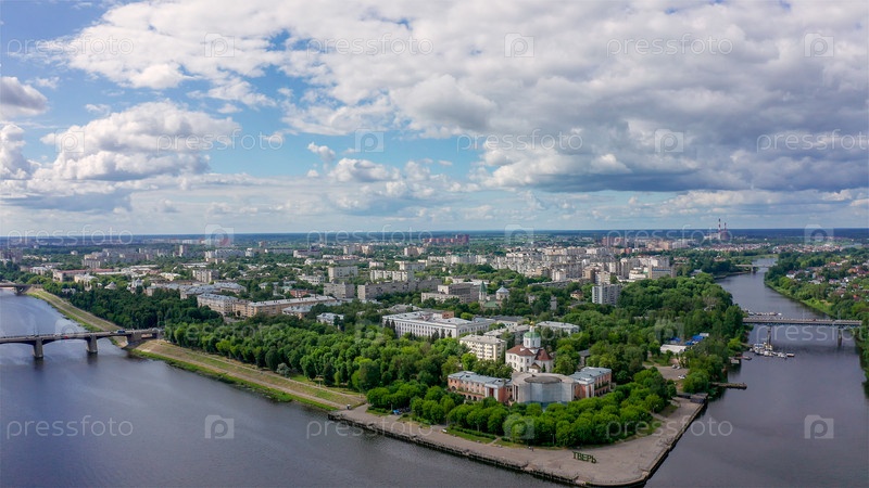 Панорама города Твери, Россия. С высоты птичьего полета. Река Волга, С Дрона