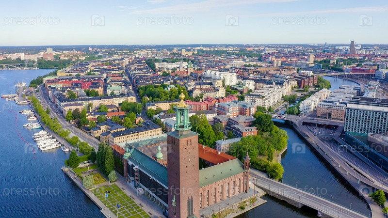 Стокгольм, Швеция. Стокгольмская ратуша. Стокгольмский стадшус. Построен в 1923 году, ратуша из красного кирпича, From Drone