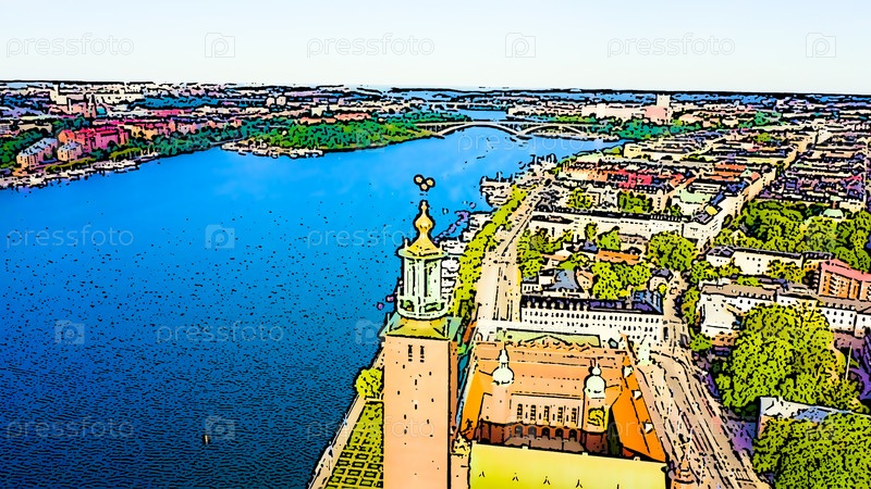 Стокгольм, Швеция. Стокгольмская ратуша. Яркая иллюстрация в мультяшном стиле. С высоты птичьего полета
