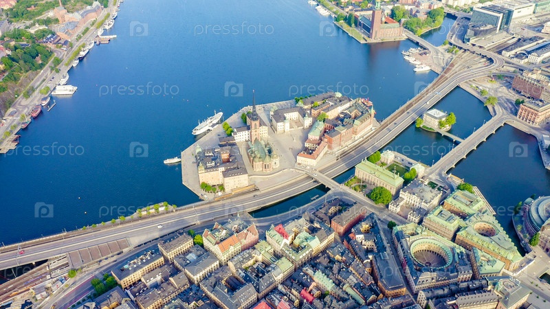 Стокгольм, Швеция. Королевский дворец, слот Кунглига. Старый город - Гамла-Стан. Риддархольмен. Вид с воздуха, из дрона