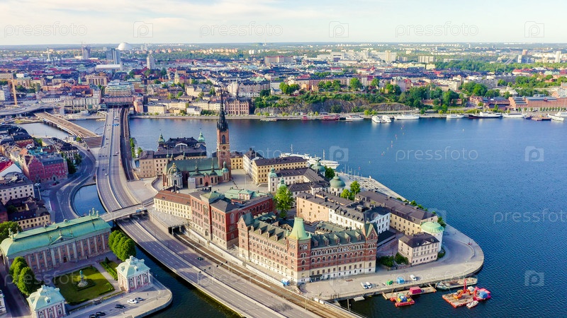 Стокгольм, Швеция. Старый город - Гамла Стан. Риддархольмен. Вид с воздуха, с дрона