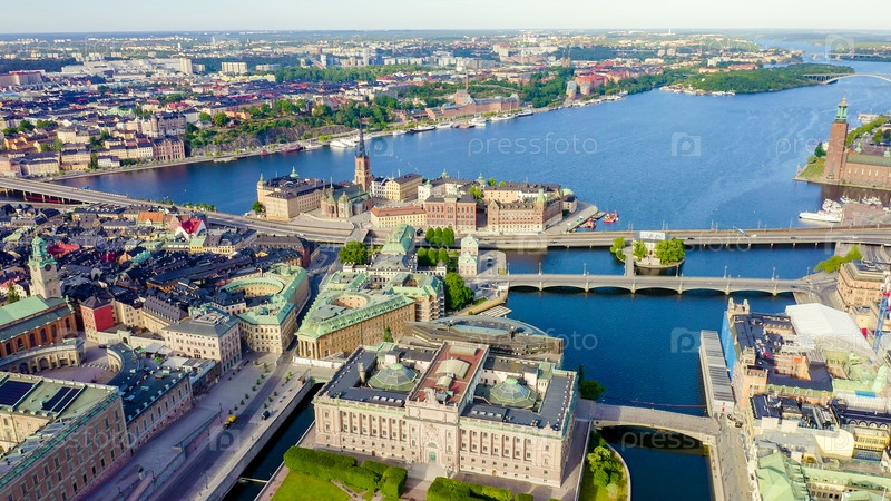 Стокгольм, Швеция. Старый город - Гамла Стан. Риддархольмен. Хельгеандсхольмен. Вид с воздуха, с дрона