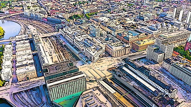 Стокгольм, Швеция. Центральный вокзал Стокгольма. Яркая иллюстрация в мультяшном стиле. С высоты птичьего полета