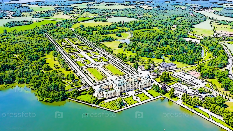 Стокгольм, Швеция. Хорошо сохранившаяся королевская резиденция с садами. Яркая иллюстрация в мультяшном стиле. С высоты птичьего полета