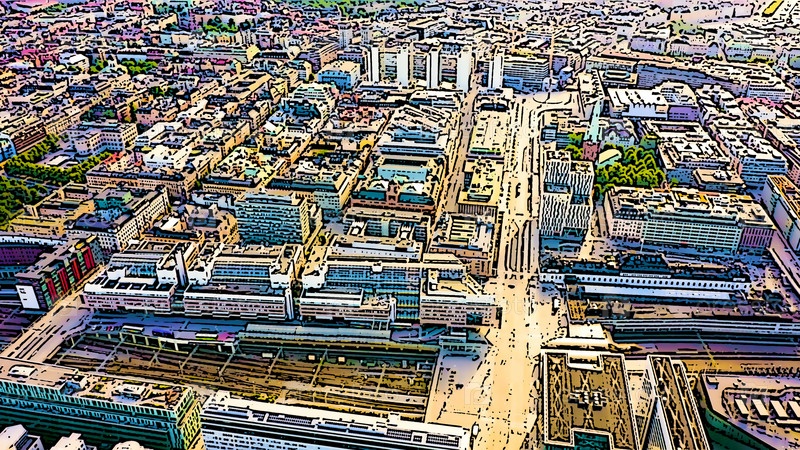 Стокгольм, Швеция. Центральный вокзал Стокгольма. Яркая иллюстрация в мультяшном стиле. С высоты птичьего полета