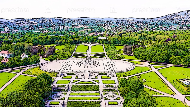 Осло, Норвегия. Общественный парк в городе Осло. Яркая иллюстрация в мультяшном стиле. С высоты птичьего полета