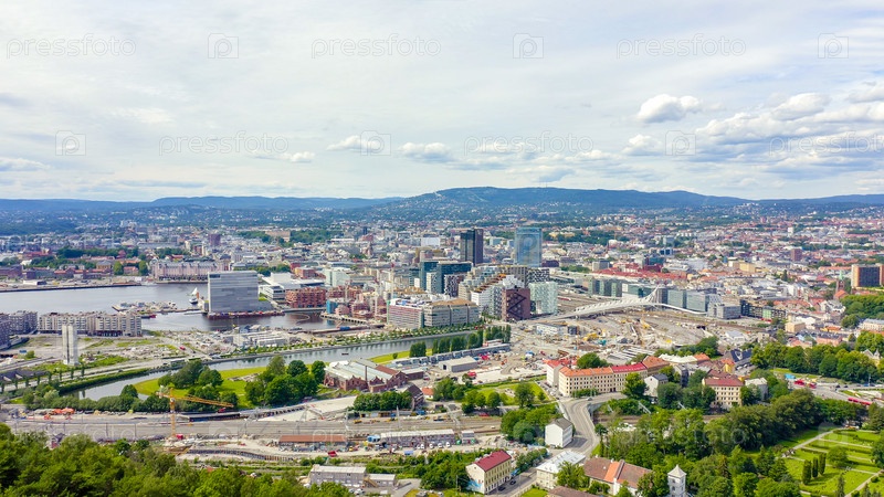 Осло, Норвегия. Центр города с воздуха. Набережная Осло-фьорда, с дрона