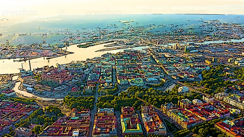 Гетеборг, Швеция. Панорама города и реки Гоэта Эльв. Исторический центр города. Закат. Яркая иллюстрация в мультяшном стиле. С высоты птичьего полета