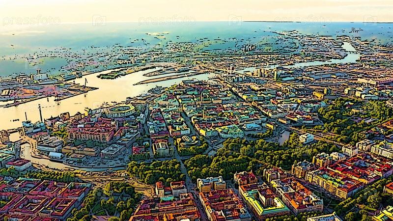 Гетеборг, Швеция. Панорама города и реки Гоэта Эльв. Исторический центр города. Закат. Яркая иллюстрация в мультяшном стиле. С высоты птичьего полета