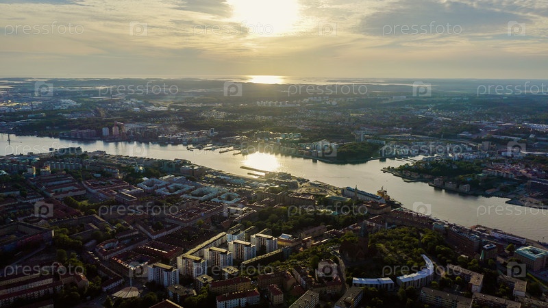Гетеборг, Швеция. Панорама города и реки Гоэта Эльв с кораблями. Закат, С Дрона