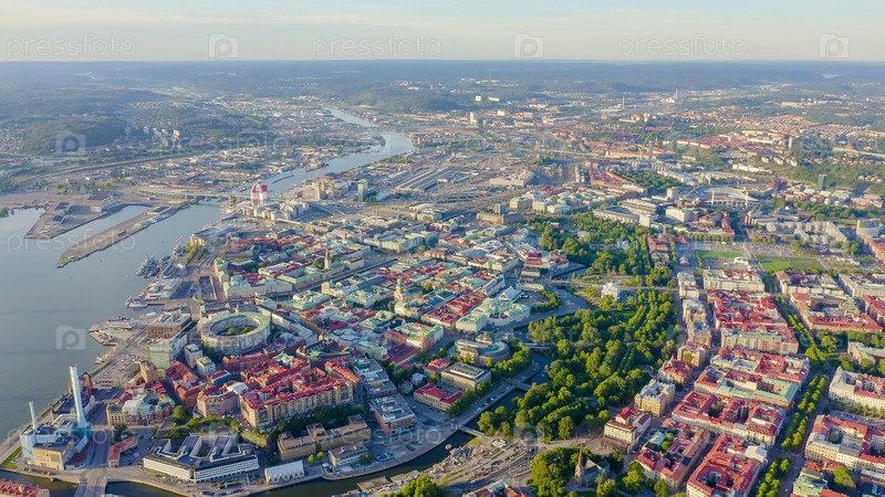 Гетеборг, Швеция. Панорама центральной части города. Закат, С Дрона