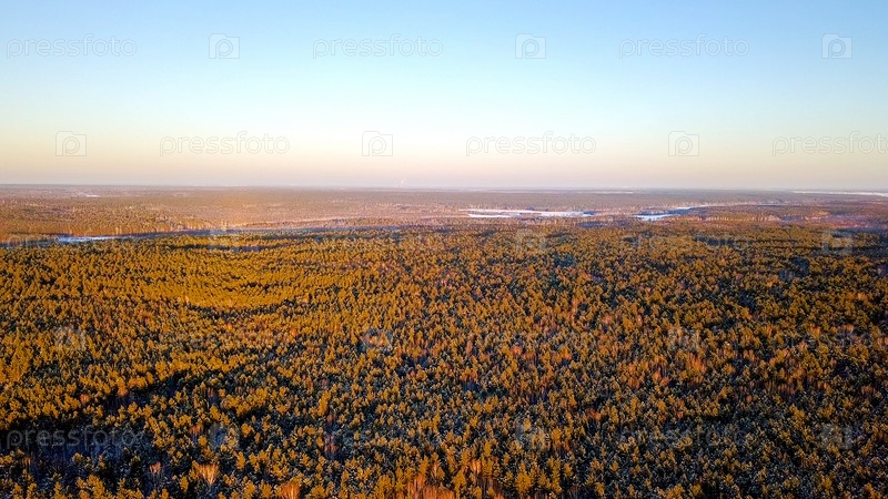 Взлет над зимним сосновым лесом. Переход на общий план с дальним горизонтом. Время заката Зимняя ясная погода, От дрона