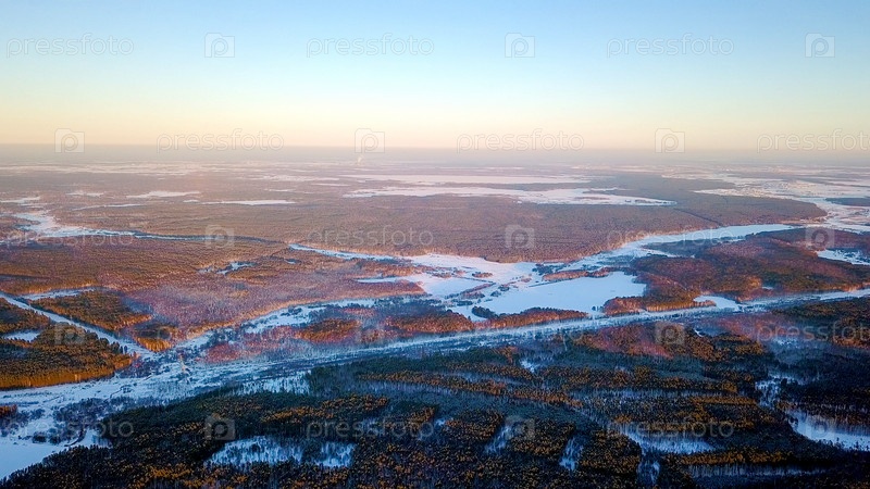 Взлет над зимним сосновым лесом. Переход на общий план с дальним горизонтом. Время заката Зимняя ясная погода, От дрона