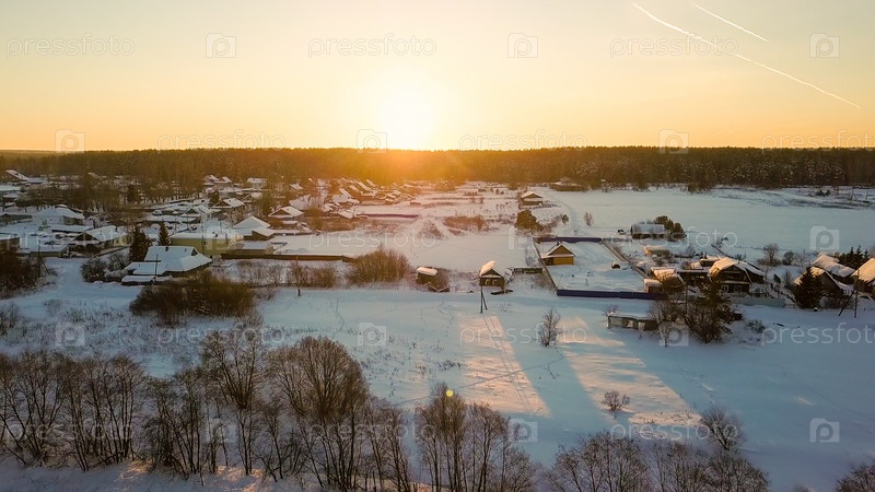 Перелет из заснеженного озера в заснеженную деревню. Зима, ясная погода, закат. подсветка, от дрона