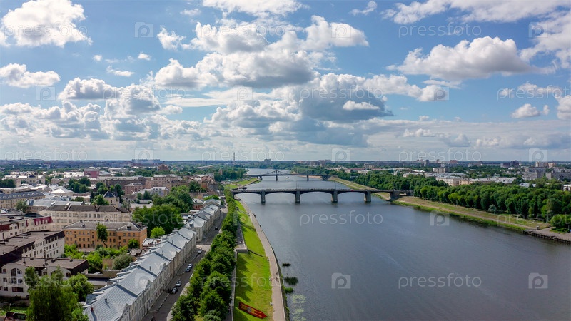 Панорама города Твери, Россия. С высоты птичьего полета. Река Волга, С Дрона