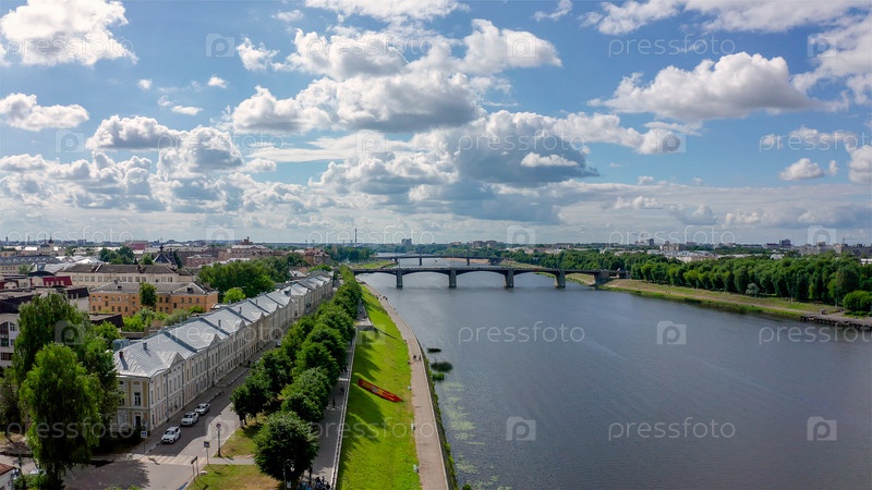 Панорама города Твери, Россия. С высоты птичьего полета. Река Волга, С Дрона