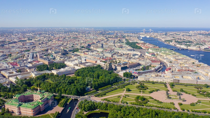 Панорамный вид с воздуха на центр Санкт-Петербурга в ясную солнечную погоду, Россия, с дрона