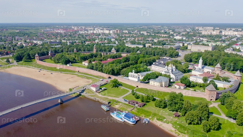 Великий Новгород, Россия. Новгородский Кремль (Детинец), река Волхов. Полет над городом, С дрона