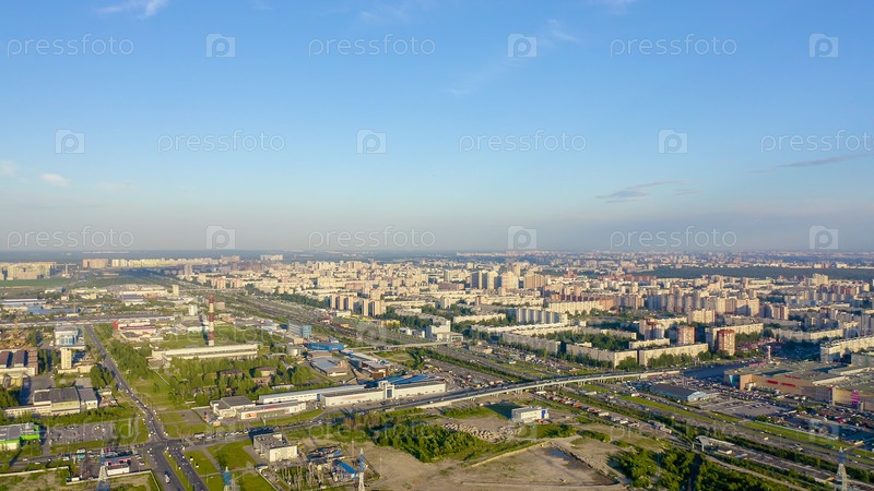 Панорамный вид на Санкт-Петербург с воздуха во время заката. Россия. Спальные места, От дрона