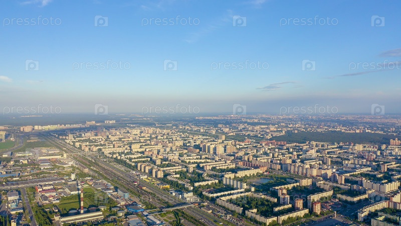 Панорамный вид на Санкт-Петербург с воздуха во время заката. Россия. Спальные места, От дрона