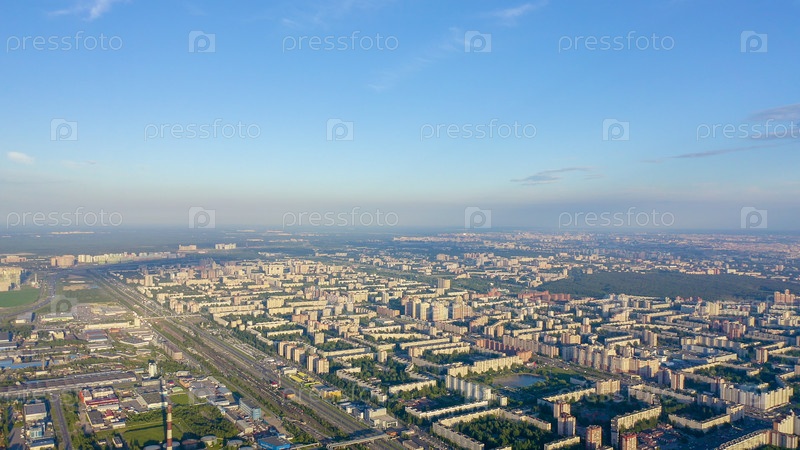 Панорамный вид на Санкт-Петербург с воздуха во время заката. Россия. Спальные места, От дрона