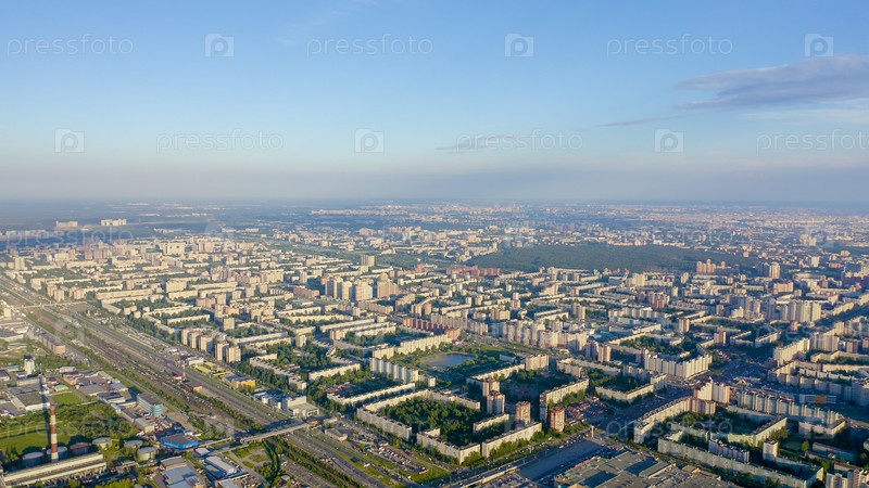 Панорамный вид на Санкт-Петербург с воздуха во время заката. Россия. Спальные места, От дрона