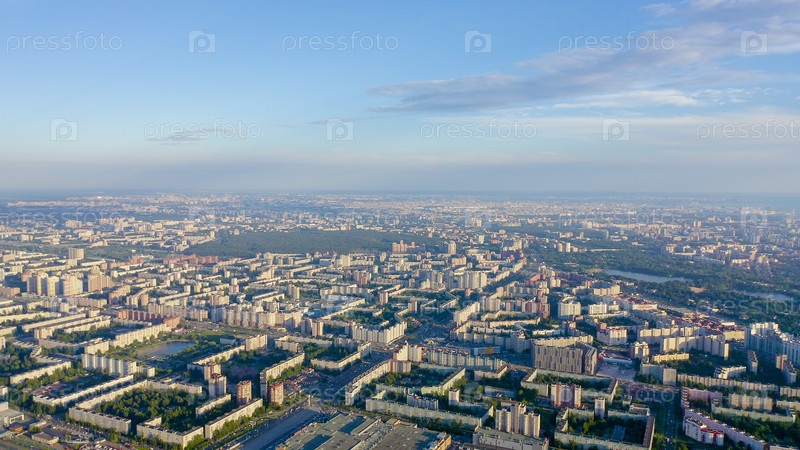 Панорамный вид на Санкт-Петербург с воздуха во время заката. Россия. Спальные места, От дрона