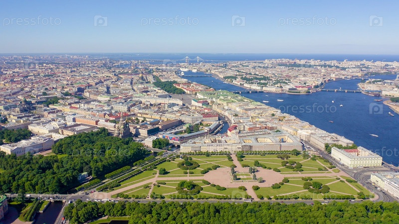 Панорамный вид с воздуха на центр Санкт-Петербурга в ясную солнечную погоду, Россия, с дрона