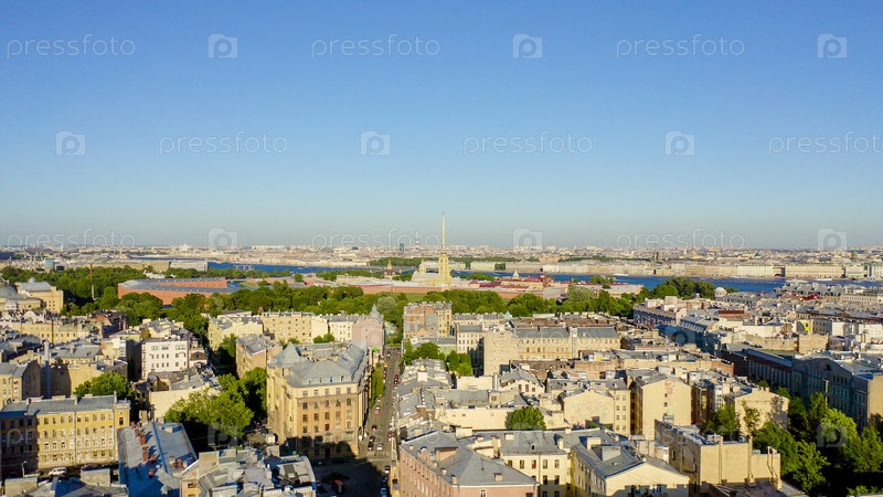 Россия, Санкт-Петербург. Река Нева. Панорамный вид с воздуха на Заячий остров и остров Артелери. Петропавловская крепость. Троицкий мост, От дрона