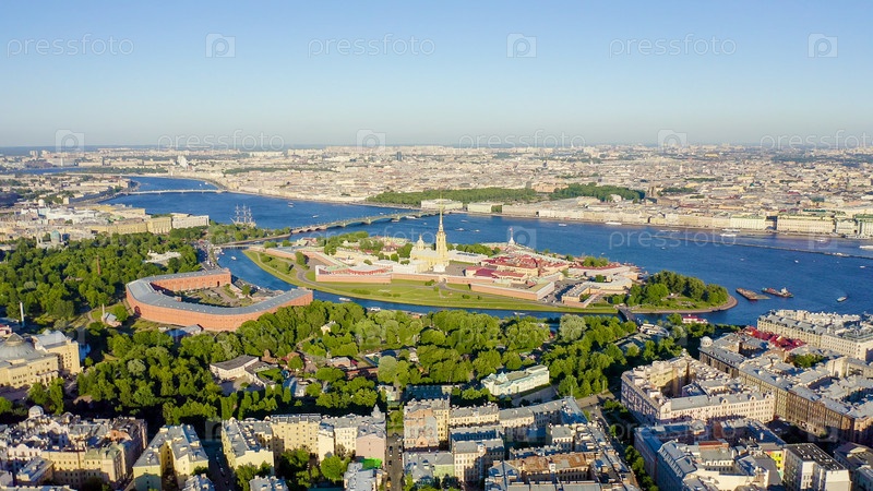 Россия, Санкт-Петербург. Река Нева. Панорамный вид с воздуха на Заячий остров и остров Артелери. Петропавловская крепость. Троицкий мост, От дрона