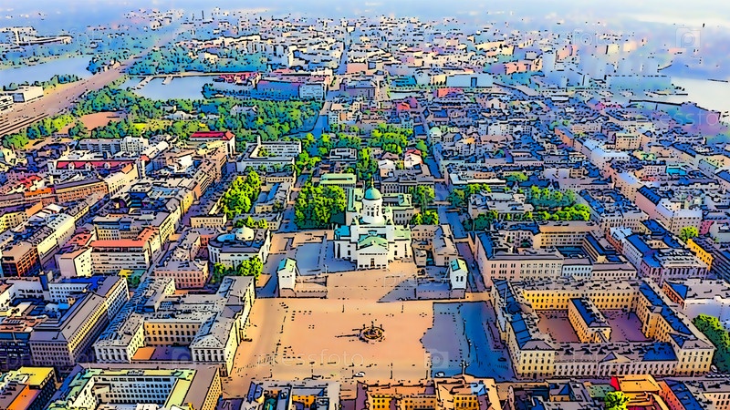 Хельсинки, Финляндия. Вид с воздуха на центр города. Хельсинкский собор. Сенатская площадь. Яркая иллюстрация в мультяшном стиле. С высоты птичьего полета