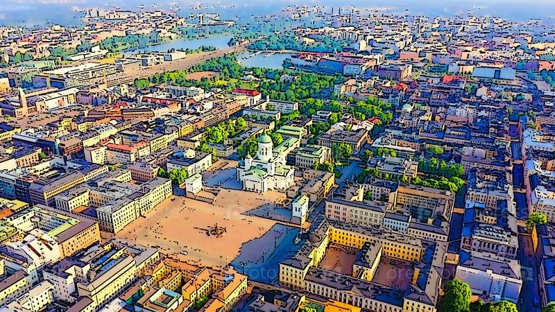 Хельсинки, Финляндия. Вид с воздуха на центр города. Хельсинкский собор. Сенатская площадь. Яркая иллюстрация в мультяшном стиле. С высоты птичьего полета